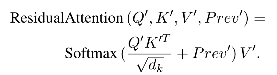 其中 \(Prev'\) 是来自上一层softmax之前的权重矩阵(多头注意力的话,则是对应的头的值),而 \(\frac{Q^{\prime}K^{\prime T}}{\sqrt{d_k}}+Prev'\) 则是传给下一层的attention的。