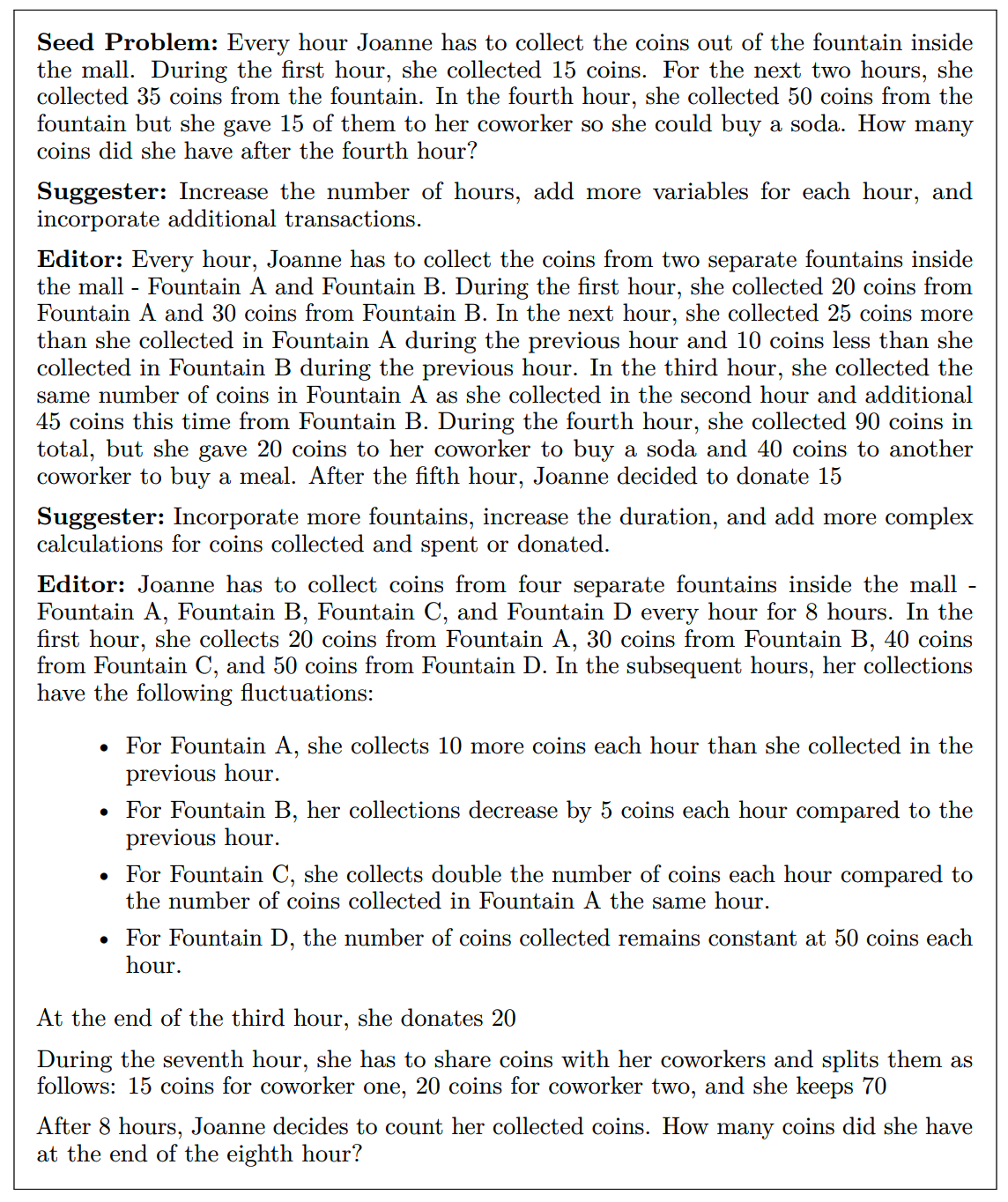 Suggester提出一些抽象、high level的建议,而Editor就根据现有的问题和Suggester的建议来修改问题。一个示例如下:
